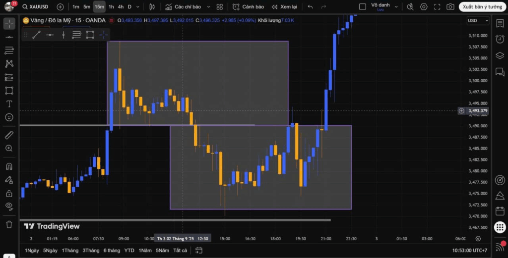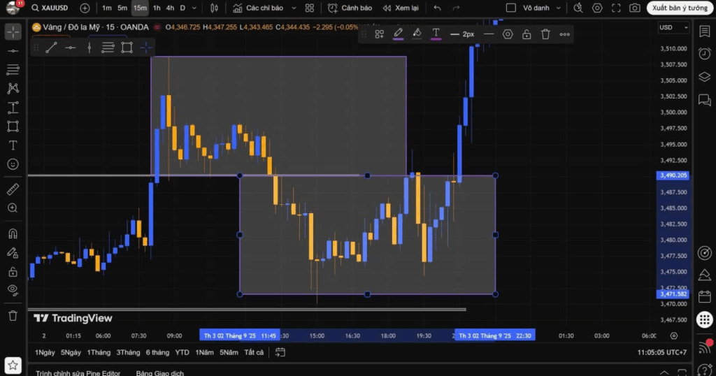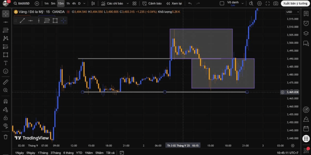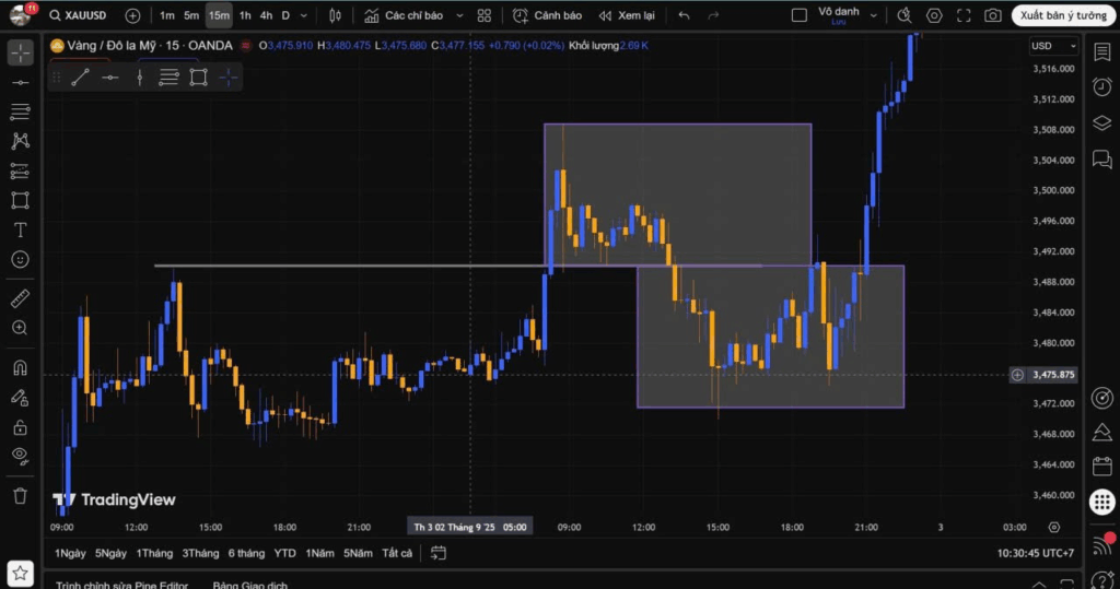 giá mở cửa của ngày 02/09/2025 là 3475.87 trong khi giá tạo đỉnh của ngày thứ 2 hôm 01/09/2025 là 3489.84. như vậy khi này mới bắt đầu thì đám đông vẫn đi theo xu hướng tăng tiếp diễn của những ngày cuối tháng 8. Ngay lúc bắt đầu 8h thì xuất hiện 1 lực mạnh đẩy lên đóng nến sát đỉnh cũ của ngày thứ 2 trước đó. và cây 8h15 đóng nến tiếp tục vượt đỉnh tạo nên làn sóng fomo người mua tham gia vào thị trường tăng đẩy giá vàng tiếp tục tăng lên đạt mức cao mới là 3508 vào lúc 8h45p tức cây M15 thứ 3 của 8h sáng ngày 02/09/2025