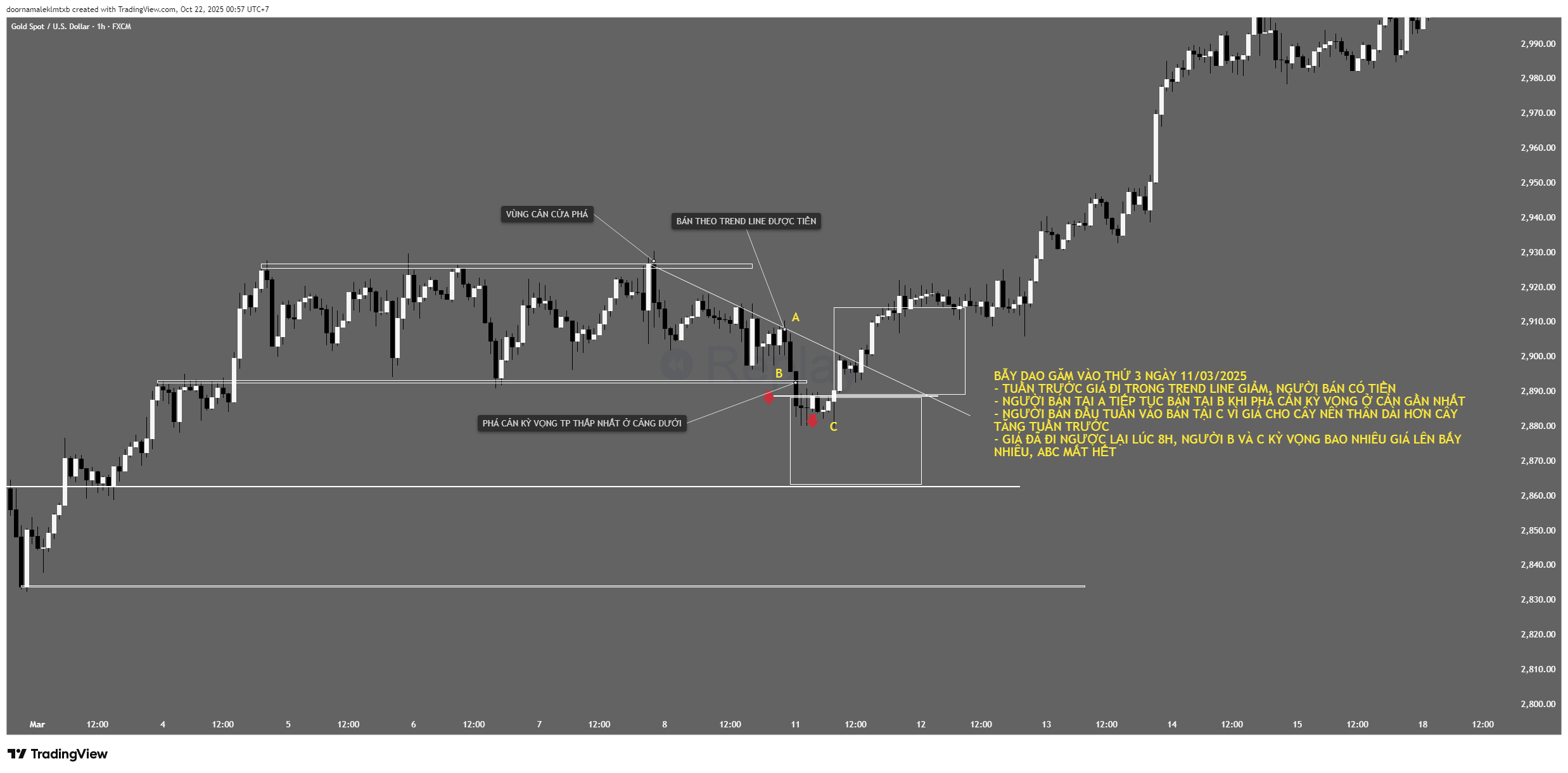 – Họ sẽ “dẫn dụ” (lure) cả hai bên vào , đẩy giá lên một chút để “diệt” (stop out) nhóm Người Bán trước , sau đó mới đập giá xuống mạnh để “diệt” nhóm Người Mua (nhóm đông hơn).