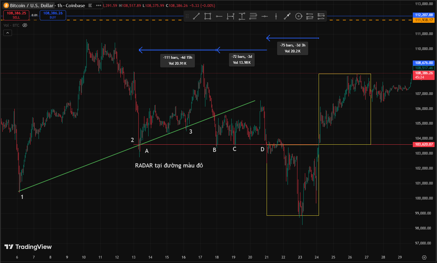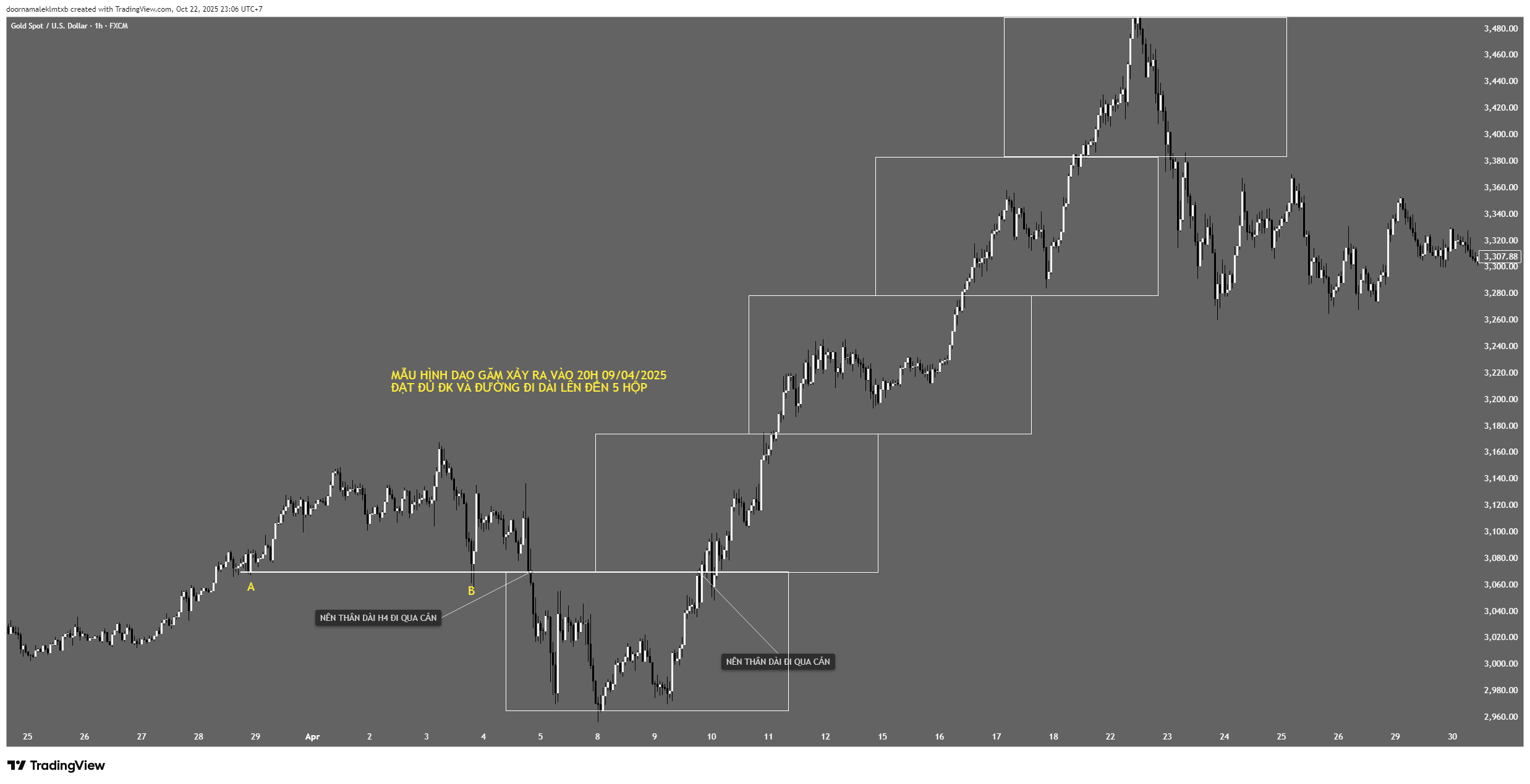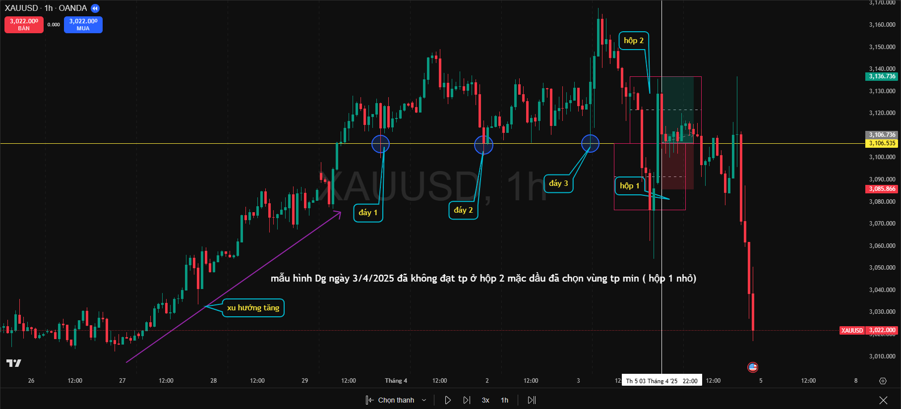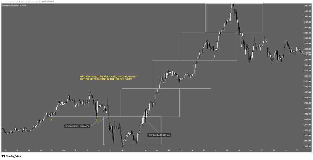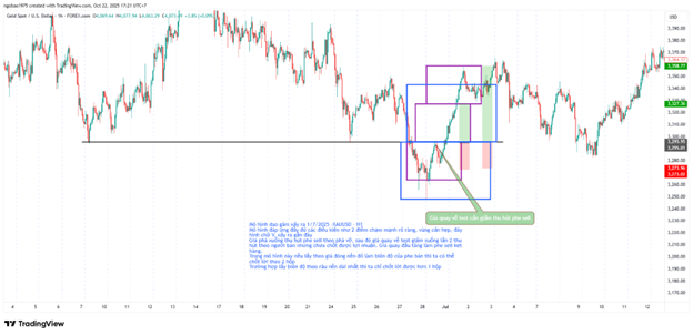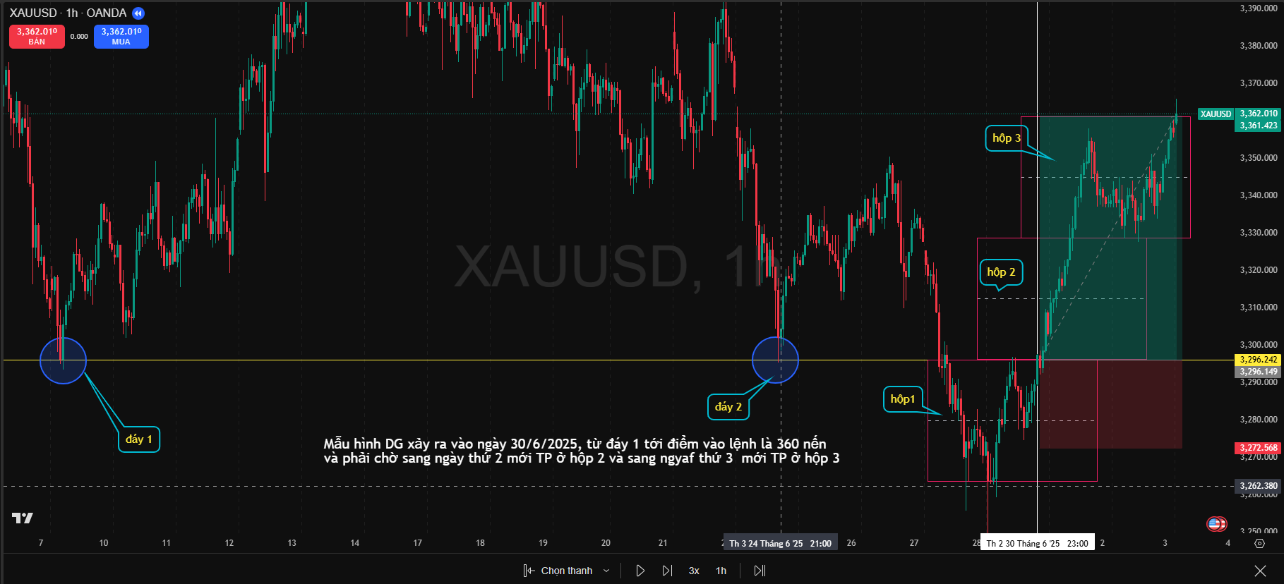 Hình số 1 này DG xảy ra ngày 30/6/2025, từ đáy 1 tới điểm vào lệnh là 360 nến H1 và phải chờ sang ngày 2 mới TP ở hộp 2 và sang ngày 3 mới TP hộp 3. Vậy mẫu hình này có được xem là mẫu Dao Găm hợp lệ không?