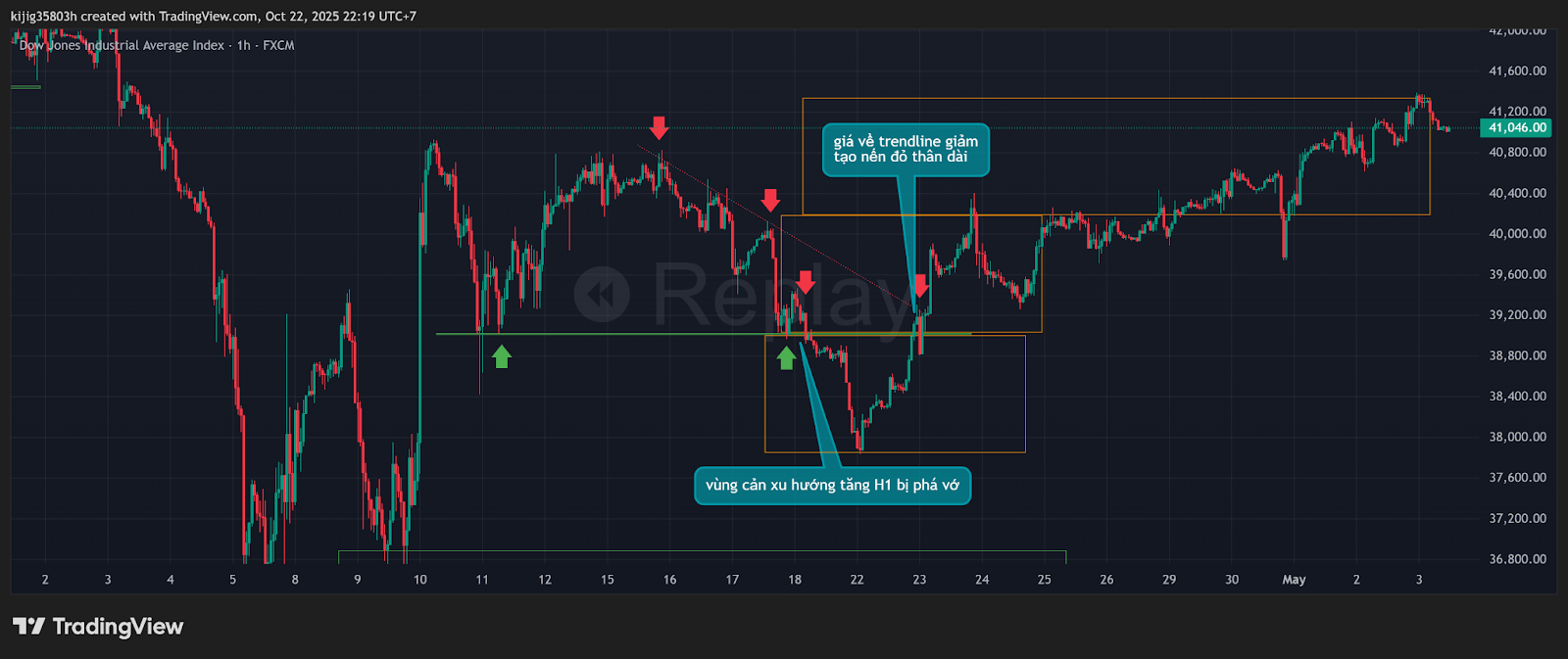 tín hiệu: nến đỏ thân dài đóng dưới vùng cản, trendline