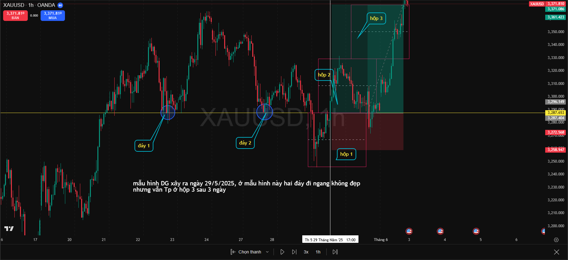 Hình số 2 này mẫu hình DG xảy ra ngày 29/5/2025, với mẫu hình này 2 đáy đi ngang không đẹp nhưng mẫu hình vẫn xảy ra và Tp ở hộp 3 sau 3 ngày. Mình xin được hỏi Tiên Sanh với mẫu hình như này mình có nên kỳ vọng chốt lời ở hộp 3 không?